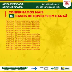 A prefeitura de Canaã lamenta informar mais um óbito ocorrido pela Covid no município, de um homem, de 65 anos, que estava internado no Hospital de Campanha. Desde o início da pandemia, são 52 óbitos ocorridos no município, e há, no momento, 71 casos ativos da doença.