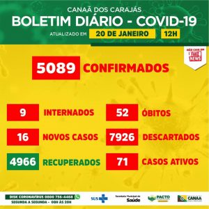 Canaã dos Carajás registrou 16 novos casos de infecção pelo coronavírus nas últimas 24 horas. Com isso, o município tem 5089 casos confirmados, dos quais: 9 estão internados e 4966 já se recuperaram.